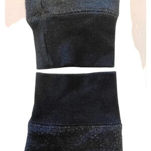 Black in color with velvet brand call out, scarf and ear muffs added! Thick and soft this top has long sleeves and a round collar.