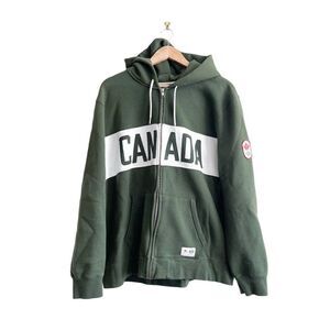 Roots Jacket Men's Hoodie Zip Up Kangaroo Pocket Canada Olympic Logo Dark Green White Size XL. Good condition-some pilling. 80% Cotton, 20% Polyester. A bit of fraying around letters. Nice heavy weight jacket. Olympic logo on left sleeve. Hudson's Bay Logo. Please see photos for details and approx. measurements.