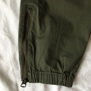 Cotton/Spandex joggers with zipper detail at the cuff. Mid-rise and slim fit throughout the leg.