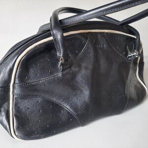 Classic Rots bag that resembles a Prada bowling bag. Black leather with white accent trim. Its in great condition, minor wear, no notable flaws.