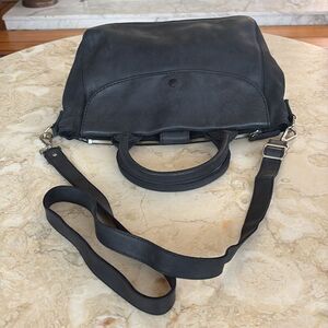 In excellent preowned condition gorgeous large capacity Roots leather bag. Features dual handles plus a removable and adjustable crossbody strap (27” drop fully extended). Stunning supple black leather and silver tone hardware.