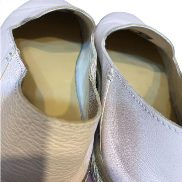 Roots leather flats in amazing used condition has very minimal wear. The outside is in immaculate used condition next to no wear the the back has slight slouched feel not too noticeable when worn. Has a very light discolouration on inside nothing major please refer to the photos for reference. The toes are almond shaped and come in a baby pink colour very on trend for doting and summer. Overall condition very good almost like new. The true is most like the fifth shot.