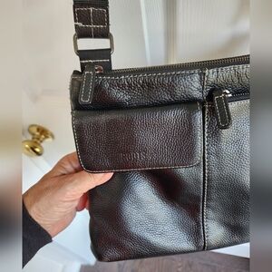 Pebble finish messenger bag. Two front pockets great for sun glasses and phone. Back pocket is large and roomy. Good place to hold an ereader or other large items. Interior is nice and deep. Leather on front only. Adjustable crossbody strap. I have this same purse and I love it!