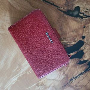 Classic Roots quality leather, beautiful colour, compact medium sized wallet, folds with snap, coin pocket with zipper, lots of slots for cards, lightly used with a bit of discoloration on the Roots emblem.