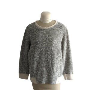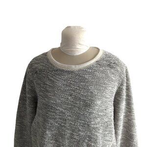 This is a black and white marled sweatshirt by Roots made with a reverse French terry fabric. -long sleeves with banded cuffs -round neckline -relaxed fit -pullover styling -91% cotton 9% polyester -Laid flat measurements: across armpit to armpit 22in, front length 24in, back length 26in In good pre-owned condition.