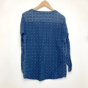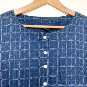 Beautiful blue color and pattern, one pocket on the front, mother of pearl buttons, 100% cotton. No stretch. Sashiko/indigo dye inspired.