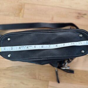 This is a very durable leather Roots shoulder bag. It has lot's of space and lot's of compartments. The handle is long enough to be used as a cross body bag if you wish.