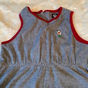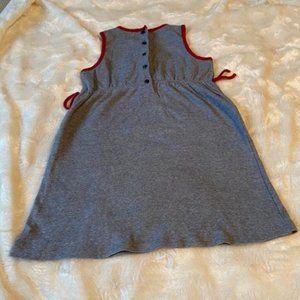 Grey and white sleeveless dress with red trim in size 4T. Embroidered flower on front bodice. Buttons on back for closure. Dress is 100% cotton. Dress is unlined. Machine wash cold, gentle cycle. Colour depends on device/screen settings and lighting in pictures. All items are from my smoke free home.