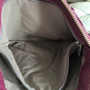 Roots Stella Flat Tribe leather crossbody bag. deep fushcia/plum purple coloured leather with white stitching, silver toned hardware, long removable/adjustable strap, exterior pocket with button snap closure, small exterior pocket with zipper closure with leather pull strings, main zipper closure with leather pull strings. Fabric lined interior with smaller pockets inside. Made in Canada. Very good used condition with some signs of wear. One spot on the leather strap where to the long strap connects has a few scratches (photos), the end of one side of the zipper teeth has some greening/tarnishing (photos), one small indent on the back exterior pocket on the leather (photos). Please see photos, measurements are for reference only. Reasonable offers welcome!