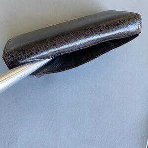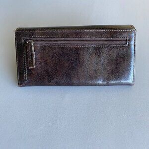 Dark brown, Features 17 cc slots + id window, interior with 5 paper slots, zipper pocket, exterior backside zip pocket, + slide in pocket, silver tone metal Roots logo applique on front. Measures 8" long x 3 3/4" tall. In very good preowned condition, minor sign of wear.