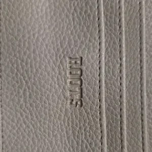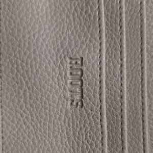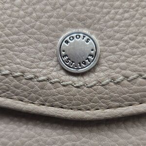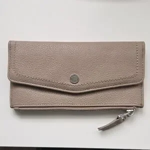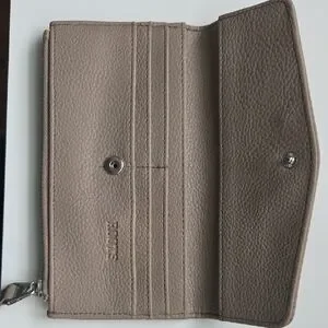 Elegant taupe slim wallet. Measures 19.5 x 10.5 cm. Sturdy zipper at the bottom to compartment for phone or spare change. Inside holds 6 cards and bills. Looks like leather but pretty sure it's synthetic. Like new, never used.