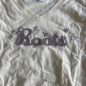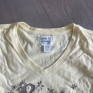 Light yellow V-neck t-shirt by Roots. Features delicate floral embroidery. Ideal for casual outings.