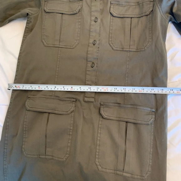 Roots Cargo Utility Style Mini Dress is perfect for transitioning from spring to summer. It offers exceptional comfort and ample stretch, making it suitable for various activities. Pair it with sneakers or flats for a stylish look. Its classic army green hue epitomizes this season's cargo style trend. Additionally, its lightweight design enhances its comfort factor. EUC condition 10/10 measurements are approximate