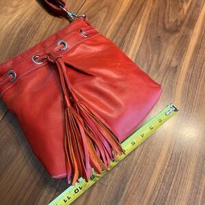 Roots handbag/crossbody bag, messenger bag style, in 100% real leather, fully lined. With adjustable strap to wear as handbag or crossbody bag or anything in between in this season's hot colour-red! Fully lined with interior pockets for phone, etc., within a zippered compartment for security. Shiny silver coloured chunky hardware for a substantial look and feel. There is an exterior pouch without zipper for quick access items with tassel detail. The slide on tassel strap slides. In good used condition with no damage , showing some insignificant evidence of use at bottom corners, zipper edge, see photos. Add the "IT" colour to your wardrobe with this practical and pretty bag from Lemon Squeezy Shop 🍋