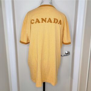 Retro orange athletic tshirt, with velvet maple leaf & Canada applique on back, by Roots Canada.