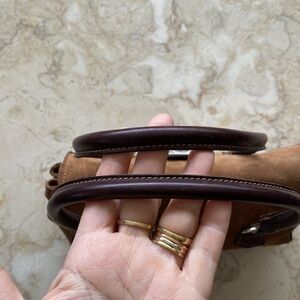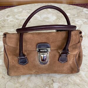 Beautiful little vintage Roots satchel bag, tan suede leather and full grain dark brown handles, bottom and trim with silver tone push lock closure and fold over top. Clean interior with a zippered compartment and two slide in pockets.