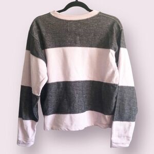 Striped Crewneck sweater from roots. Pink and grey striped pattern. Super cozy, oversized fit. Size XS