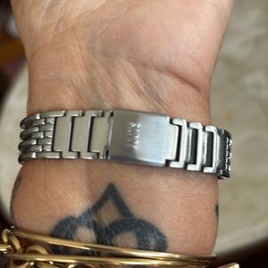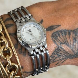 In excellent preowned condition Roots Sunrise stainless steel watch. Elegant all steel band and case, matching monochromatic silver dial with Roman numerals (12, 3, 6, 9) hour markers. "ROOTS" logo prominently displayed on the dial. Japan movement, water resistant to 50 meters.