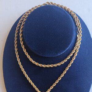 The chain is a rope style, gold-colored with a red hanging flower, somewhat translucent with red petals and a dark black center.