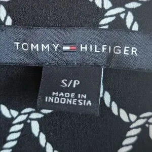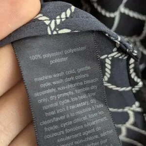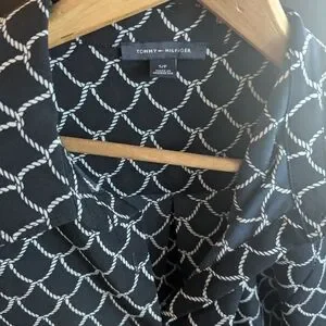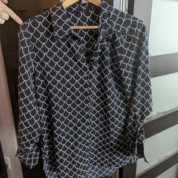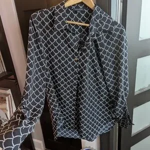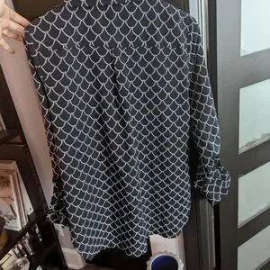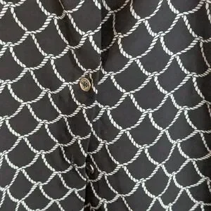 Elevate your wardrobe with this stylish (dark navy? black?) and white patterned top. Perfect for any occasion, this top offers both comfort and elegance.