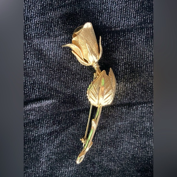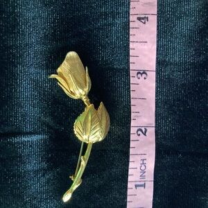 Gold rose brooch with a detailed petal and leaf design. Adds a refined floral accent to jackets, dresses, or scarves. Lightweight and easy to wear for everyday or special occasions. Features a polished gold finish for classic appeal. Easy back clasp and a classic brooch for hats, scarves, lapels, a wedding bouquet and anything else you’d like. In excellent vintage condition.