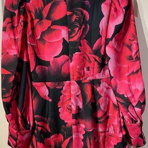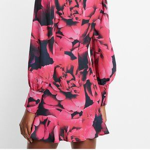 NWOT gorgeous Express floral print, lined dress. Purchased in store and never wore. Perfect for a night out on the town, date night, or especially Valentine's day coming up. Features a mock neck design and cute ruffled hem.