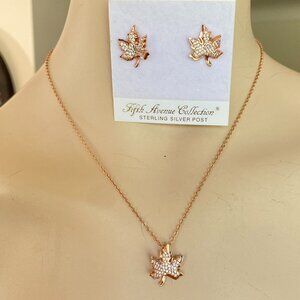 NEW In Box Fifth Avenue Collection Rhodium Plated Rose Gold Cubic Zirconia Maple Leaf Earrings & Necklace. 18" + 1.5" extender chain, 3/4" Long maple leafs. Sterling silver earring posts, hypoallergenic, Free from nickel, lead and cadmium.