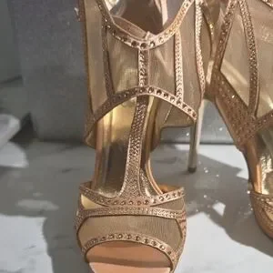 Dazzling gold heels with intricate design. Perfect for evening wear. Elevate your style effortlessly. Only worn once. 4" heel