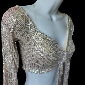 Long Sleeve Cropped Top that ties on the front and short Skirt, covered in sequins.