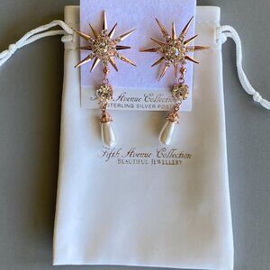 New With Tag, Fifth Avenue Collection 3-dimensional Rose Gold Tone Starburst Swarovski Clear Crystal Dangle Earrings with tear drop shape faux pearl. 2 3/4" long. Simply Stunning! Sterling silver posts, rhodium plated, nickel, lead & cadmium free, hypoallergenic.