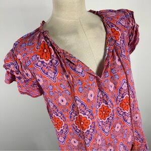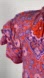 Chic blouse with intricate floral design. Features vibrant red and purple tones. Ideal for casual or dressy occasions.