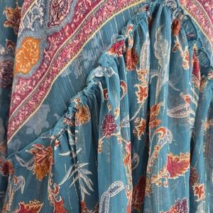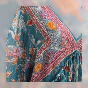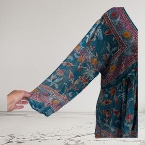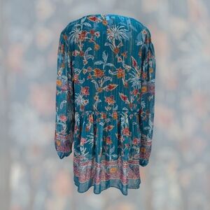 Chic floral tunic with a V-neck design. Features vibrant teal and pink hues. Boho style sleeves Perfect for a stylish look. Length 27" Bust 36" Sleeves 19"