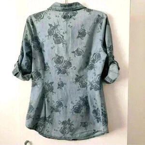 Button down shirt with rose print in blue washed denim colour. Pearly snap buttons. 3/4 Roll-Up sleeves with tabs.