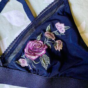 Look and feel your best in this stylish Rose + Vine Triangle Mesh Bra Bralette! This beautiful bralette features a floral/rose embroidery on cups and the cross back design is perfect for light impact and casual activities. The unlined black mesh fabric is soft and comfortable, making it perfect for everyday wear. Get ready to make a statement with this unique bralette!