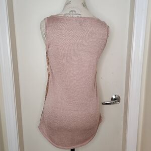 Sparkly metallic rose gold thread & blush pink viscose knit scoop neck tank top with rose gold pattern sequins front, by Le Chateau.