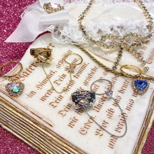 Goldtone ribbon ring and delicate pink teardrop rhinestone ring with connecting chain from Japanese boutique RoseMarie Seoir. Made from gold-plated brass. I am also selling a matching gold ribbon ring with no connector which is slightly chunkier. I have one listed in rose gold as well.