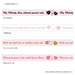 RoseMarie Seoir x Sanrio collab Marroncream princess ribbon headband with rhinestone cabochon. Pastel pink printed ribbon with white ruffle trim and bow. The satin ribbon is printed with red text. A pink rectangle rhinestone cabochon is placed at the center of the bow surrounded by tiny clear rhinestones. Imported from Japan.
