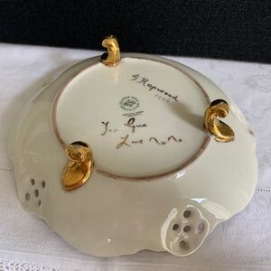 Bowl rests on three little gold feet and has five reticulated medallions around the top edge.