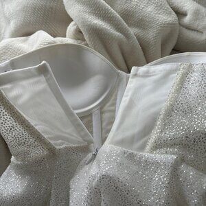 This stunning mini dress features a shimmering silver color with sequin embellishments and a strapless sweetheart neckline, perfect for special occasions.