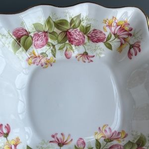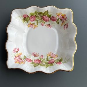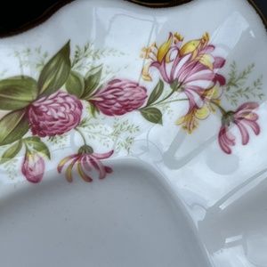 Rosina bone china snack dish, honeysuckle & thistle, gold accents, like new.