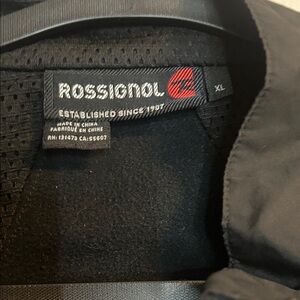 Sleek black windbreaker by Rossignol. Features white accent lines. Ideal for outdoor activities.