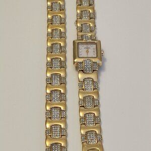 Rotary Rectangular Gold plated Watch Studded Clear Stones and Matching Bracelet
