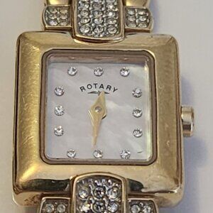 Rectangular, gold-plated ladies' watch. The face features small, crystal-like stones at the hours. The text on the face says "ROTARY," "SWISS MADE." The band is gold-toned and has a woven, "bark" effect.
