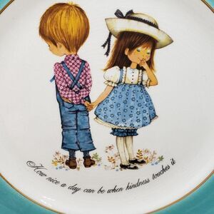 Approx. size: 9 in (D) and there's a manufacturer's flaw on turquoise border (see pic) and aged crazing. A timeless collectors plate made in Staffordshire, England in the 1980s by Roth in the Petticoats and Pantaloons Third Edition series with the caption, "How nice a day can be when kindness touches it". This plate has a turquoise border with the middle and edge of the plate having gold rims. A collector's delight!