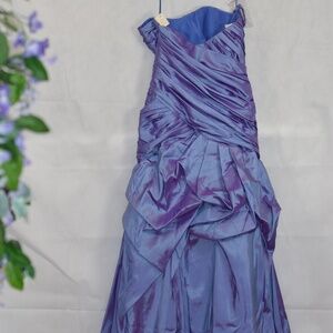 Gorgeous Rouched Prom dress. The purple color shimmers in the light and has layers of purple colours. Beautifully touched. Pit to pit 18 in.