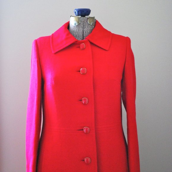 This Rouge Trench Coat is made of 100% Pure New Wool and lined in a red satin material. This coat has a bell-shape with double seam detailing down the front and back as well as defines the waist. It has two pockets in the front and is fastened with 5 square red vintage buttons with gold detailing.