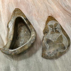 Beautiful hand crafted etched soap stone? trinket box with butterly images. Made by a local craftsman, "P.K. 2003" noted on bottom.