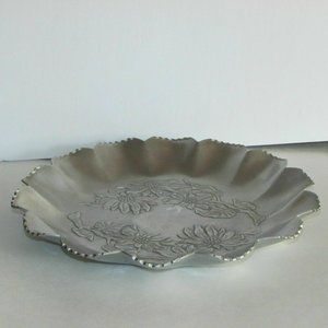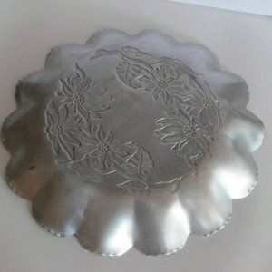 Vintage shallow aluminum bowl or tray with large embossed floral design. Pattern is Poinsettia.