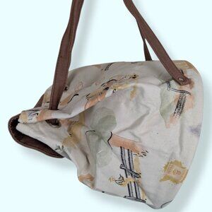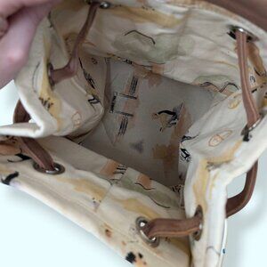 This little backpack is beige with a round bottom and a small brown top flap with a magnetic closure. The straps seen on the back of the bag loop through the rings at the top, cinching the bag closed when pulled. The bag doesn't have a tag listing material content, but my best guess would be cotton or canvas related. The fabric is covered in pastel watercolour-style images of horses, people riding horses, and other ranch-related images. The bag is in good condition overall with the exception of 2 things. The first is that the previous owner must have been storing patchouli in the bag, as you can still smell it if you put your head right in the bag. The second, more importantly, is the presence of rust on the silver top rings. I don't understand how this happened as the rest of the bag seems so untouched, but it's there (see last 2 pics as an example). There are also some reddish orange spots as a result of this. For this reason, the bag is listed lower than it would be otherwise.