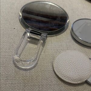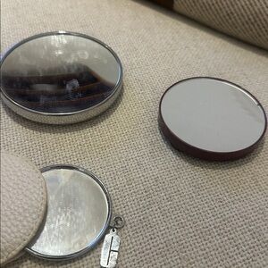 Set of round compact mirrors in silver and brown. Perfect for on-the-go touch-ups. One has a pouch. See pics for pouch condition with some discoloration.